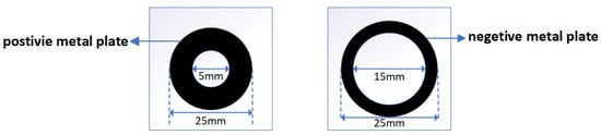 This article adopts a differential structure to solve the problems of low conversion ratio and large measurement error due to the environmental impact of unipolar plate sensors. The design diagram of the differential sensors is presented in Figure 1. The outer diameter of the positive plate is 25 mm, and the inner diameter is 5 mm. The outer diameter of the negative plate is also 25 mm, and the inner diameter is 15 mm. The spacing w between the two plates is 1.2 cm.