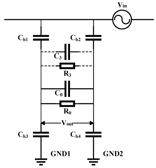 The equivalent circuit diagram of the differential sensor is shown in Figure 2, where represents the coupling capacitance between the live conductor and the positive electrode plate; represents the coupling capacitance between the live conductor and the negative electrode plate; refers to the coupling capacitance between the positive electrode plate and the earth; represents the coupling capacitance between the negative electrode plate and the earth; denotes the coupling capacitance between the positive and negative plates; represents the load resistance; represents the parallel capacitance between the positive and negative plates; and denotes the parallel resistance between the positive and negative plates. The transfer function of the differential sensor is described as follows: