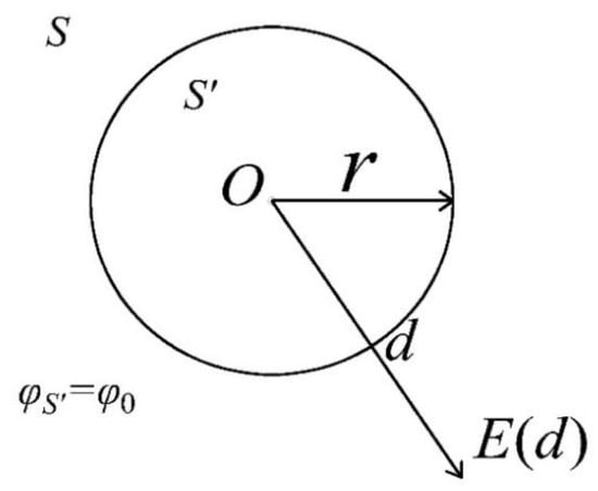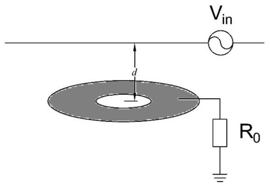 where refers to the dielectric constant of the air, r represents the radius of the live conductor, and d represents the distance from a point to the live conductor. Furthermore, since , can be simplified as . Figure 4 shows the basic model of non-contact electric field measurement. The amount of induced charge in the plate q can be obtained from Gauss’s theorem: