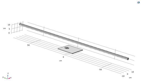 The equivalent square of the electrode plate is determined by three factors: (1) The square of the electrode plate; (2) the distance between the electrode plate and the live conductor d; and (3) the distance between the two plates w. To evaluate the influence of d and w on the sensor’s transformation ratio and output voltage amplitude, COMSOL Multiphysics is employed for simulation. The simulation scenario consists of the electrode plates and a 1 kV overhead line arranged horizontally at a height of 10 cm. The diagram of the simulation scenario is shown in Figure 5.