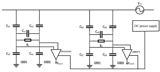 In this paper, the sensor is designed with a dual channel, which consists of a high-frequency measurement channel and power-frequency measurement channel. The power-frequency measurement channel uses a INA111AU differential operational amplifier with an internal resistance of about , while adopting high internal resistance will lead to the serious voltage wave reflection of the sensor’s high-frequency response, resulting in a large measurement deviation. Therefore, the high-frequency measurement channel utilizes a AD8274 differential op amp with a low internal resistance of about 36 k. The whole design is shown in Figure 7.