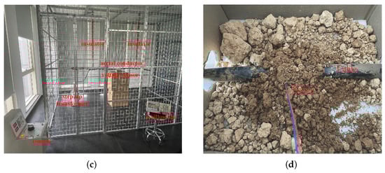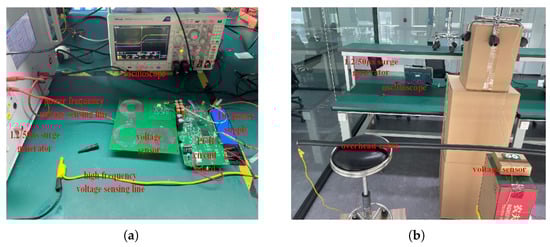 Experimental platform: (a) low-voltage experimental environment; (b) high-voltage high-frequency overhead line experimental environment; (c) high-voltage power-frequency overhead line experimental environment; and (d) high-voltage power-frequency cable experimental environment.