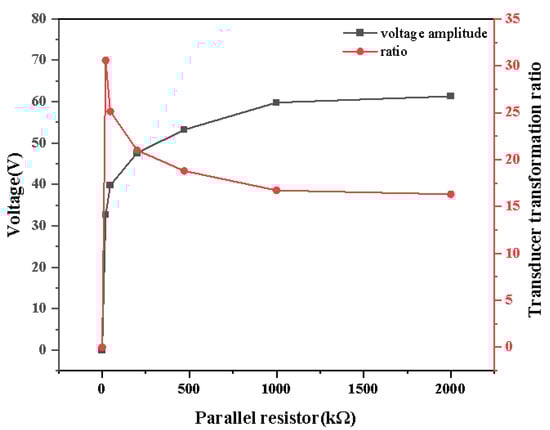 Since the variation of the parallel resistor is orders of magnitude greater than the parallel capacitor, the parallel resistor predominantly determines the charge and discharge process between the plates. The parallel resistor parameters significantly affect the acquisition of high-frequency voltage signals but have little impact on the acquisition of power-frequency voltage signals. Thus, this section focuses on the influence of the parallel resistor on the sensor’s high-frequency response. First, in environment 1, a 1.2/50 μs surge generator sends out a lightning surge waveform with an amplitude of 1 kV. Without considering the parallel capacitor, the parallel resistance is adjusted only. The measured results are summed up in Figure 9. The amplitude of the sensor output signal increases continuously while the increment is diminishing. The sensor’s transformation ratio decreases with the increase in parallel resistance and eventually becomes stable. This conclusion can also be deduced from (1). Thus, the experimental results are consistent with the theoretical analysis.