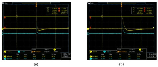 Then, the influence of resistance on the sensor waveform is analyzed. Figure 10a,b show the measured waveforms with respect to the parallel resistances of 20 k and 47 k, respectively. The 1.2/50 μs surge waveform has a rise time of approximately 2 μs, while the fall time (time to decay to 50% of peak) is 50 μs. The yellow line denotes the voltage waveform output by the sensor, and the blue line refers to the waveform of the original signal. Figure 10 exhibits that when the parallel resistance is 20 k, the rising edge of the output waveform performs better, while the falling edge exhibits poor tracking performance. When the parallel resistance increases to 47 k, the falling edge of the output waveform of the sensor is significantly improved. However, in the case of very large parallel resistance, the charging and discharging time between the plates becomes longer, which reveals that the falling edge of the sensor output waveform falls slowly, and the measurement results increasingly deviate from the original signal.