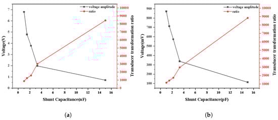 Under the high-frequency experimental environment of the overhead line, 1 kV surge voltage is applied to test the high-frequency signal with 1 M parallel resistance. Experimental results are displayed in Figure 11. Through Figure 11a,b, it can be concluded that the amplitude of the induced voltage is negatively correlated with the parallel capacitance and the transformation ratio is positively correlated with the parallel capacitance. When the sensor measures signals of different frequencies, its transformation ratio tends to be constant, with the increase in parallel capacitance .