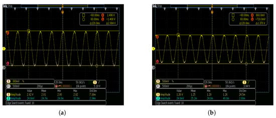The parallel resistance and capacitance in the middle of the plates constitute a filter circuit, which attenuates high-frequency signals and significantly enhances the waveform quality of the sensor’s power-frequency response. Under the power-frequency high-voltage experimental environment of the overhead line, the output waveform of the sensor measured by the oscilloscope is depicted in Figure 12. In the absence of the parallel capacitor, the power-frequency response waveform quality is inferior due to harmonic components, i.e., the existence of burrs in the waveform. In the presence of the parallel capacitor, its power-frequency response is more precise.