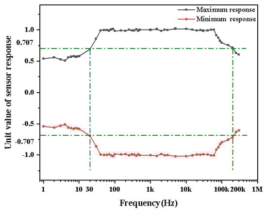 We utilize the frequency response analyzer to generate a 1 Hz–200 kHz sinusoidal voltage wave and investigate the sensor’s bandwidth. In total, 10 groups of data are measured at each frequency level, and the maximum and minimum unit values of the sensor response at each frequency are recorded, as shown in Figure 14. The response for the signal between 50 Hz and 80 kHZ is relatively stable, while the response is equal to of its maximum response as the signal frequency reaches 200 kHz. To sum up, the bandwidth of the electric field coupled sensor ranges from 30 Hz to 200 kHz.