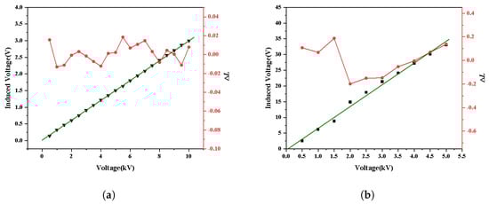 Nonlinear error performance of the sensor in power-frequency: (a) linear fitting results and nonlinear errors of environment 2; (b) linear fitting results and nonlinear errors of environment 3.