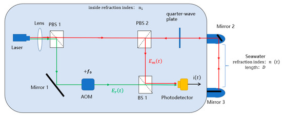 The refractive index of seawater, which reflects key parameters such as temperature, salinity, and density, is of significant importance in marine environmental monitoring. High-precision measurements of seawater refractive index have become a critical challenge in marine environmental monitoring techniques [1,2,3,4]. According to studies by Rusby and Stanley on the same seawater [5,6], when the temperature remains constant, a change of 1‰ in salinity results in a refractive index variation of RIU. In the North Atlantic, during winter, a 1 °C change in seawater temperature causes a refractive index change of RIU; during summer, a 1 °C temperature change results in a refractive index variation of RIU. Refractive index variations also differ across different marine regions at the same time due to factors such as ocean currents and solar radiation [7]. According to the actual measurement data of Japanese scientists, in the deep-sea area along 149° E in the western North Pacific, the meridional gradient of the refractive index is that it changes by RIU per 100 km in the area from (149° E, 23° N) to (149° E, 26° N). The zonal gradient is that the change in the seawater refractive index is RIU per 100 km [8]. The measurement accuracies that the existing optical measurement methods for refractive index changes can achieve, such as the laser deflection method [9], the surface plasmon resonance method [10], the fiber Bragg grating method [11], and the critical angle method [12], are , , RIU, and RIU, respectively. The method based on laser interferometry can reach a maximum accuracy of RIU, which is the highest known accuracy at present [13,14].