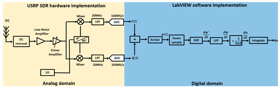 This paper employs the Universal Software Radio Peripheral Software-Defined Radio (USRP-SDR) as the hardware platform for refractive index signal demodulation and utilizes NI LabVIEW 2019 (64-bit) as the software platform. The specific demodulation algorithm flowchart is shown in Figure 2.