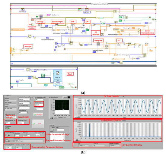 Signal processing flow based on LabVIEW. (a) LabVIEW block panel; (b) LabVIEW front panel.