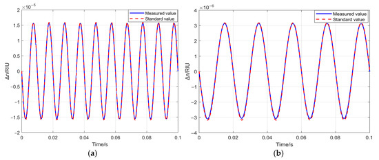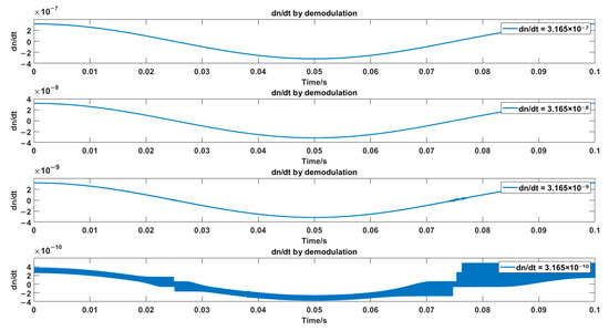 During the simulation process, the low-pass filter is a Butterworth filter with an order of 12, a cut-off frequency of 1 kHz, and a passband ripple of 0.2 dB. The local oscillator frequency MHz, Hz, and the detection range is set to 0.1 m. To obtain the minimum refractive index variation rate based on IQ demodulation, different refractive index variation rates are set with a step size of one order of magnitude. The demodulated refractive index variation rate signals are compared with the set refractive index variation rate signals, and the results are shown in Figure 4.