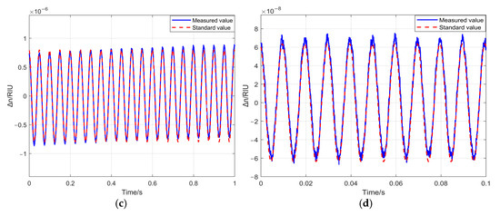 Standard values and SDR measurement values corresponding to typical refractive index changes. (a) Comparison between the waveform measured by SDR and the standard waveform when RIU; (b) comparison between the waveform measured by SDR and the standard waveform when RIU; (c) comparison between the waveform measured by SDR and the standard waveform when RIU; (d) comparison between the waveform measured by SDR and the standard waveform when RIU.
