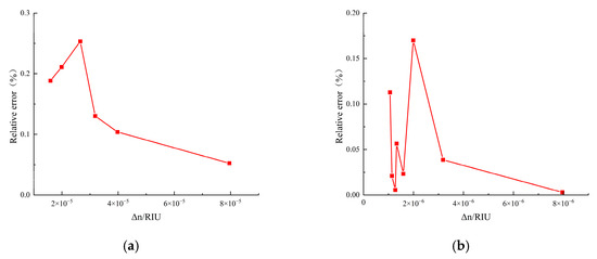 As decreases, the overlap between the standard value and the measured value from SDR demodulation reduces. This is because the spectral purity of the signal generator declines, and the noise influence becomes more prominent as decreases. By adjusting the frequency deviation and rate, multiple specific values are established under the same refractive index variation. The relative error E of the demodulation results is defined as follows: