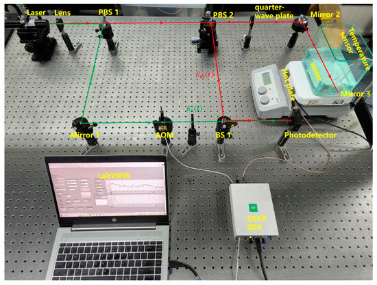 Based on Figure 1, an optical coherent measurement system for seawater refractive index was constructed using software-defined radio (SDR) as shown in Figure 9. The detection range was 0.17 m. Deionized water’s high purity allows for precise control of experimental conditions. Moreover, both deionized water and seawater are transparent media and follow the same principle in the physical process of laser interference. Hence, deionized water can be used as the test target. Reflective tape was attached to the container glass to act as Mirror 3. Temperature adjustments were made using a heating platform to induce changes in the refractive index, and a temperature sensor was used to measure the real-time temperature of the deionized water. After entering the photodetector, the interference signals were processed sequentially through the USRP-SDR and LabVIEW for demodulation, ultimately yielding information on the refractive index variations.
