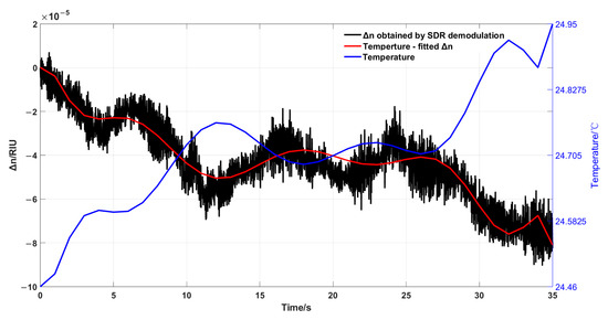 T represents the temperature of the deionized water, and represents the laser wavelength, which is 633 nm. The refractive index variation is calculated as = RIU under the given temperature changes. The curves representing the refractive index variation derived from temperature fitting and the refractive index variation obtained through SDR demodulation are illustrated in Figure 10.