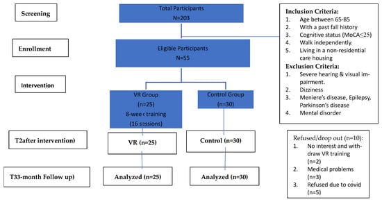 Ten eligible enrolled participants dropped out unexpectedly due to medical reasons (n = 3) and loss of interest (n = 2) in the VR group; some (n = 5) in the control group refused to continue due to spreading anxiety. In total, 10 participants dropped out throughout the study; the refusal rate in the VR group (n = 2) was less than that of the control group (n = 5). Finally, 84.62% (n = 55) participants were analyzed to investigate the relationship between Virtual Reality technology-based training and the risk factors of fall.
