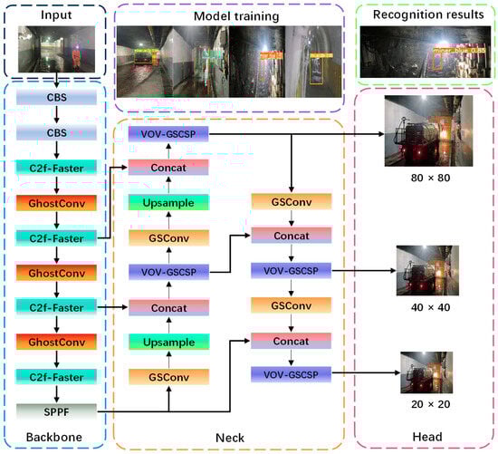 For the monitoring task associated with air door scenarios, the primary detection targets to consider are vehicles and personnel passing through the air door. In these scenarios, the vehicle in question is an explosion-proof trackless rubber-wheeled vehicle. To further regulate the types of vehicles traversing the air door and to ensure the safety of mining operations, this paper identifies the specific type of explosion-proof trackless rubber-wheeled vehicle involved. License plate recognition is primarily employed for managing entry and exit in conventional intelligent vehicles [12]. However, this approach demonstrates low detection efficiency in complex mining environments, which are characterized by factors such as dim lighting conditions, obscured monitoring lenses due to construction activities, and coal dust obstructing license plates. Zhu Jinrong et al. [13] employed morphological operations in conjunction with Fourier descriptors to extract vehicle contour curves, subsequently facilitating vehicle recognition. This method is well-suited for high-speed traffic environments and can significantly reduce both false positives and missed detections. However, the model’s adaptability to complex traffic scenarios remains limited. To tackle the challenges associated with the hybrid detection and recognition of both large and small targets, Yu Jie et al. [14] proposed a vehicle recognition algorithm based on a cascade multi-task deep neural network. This approach integrates an enhanced YOLO algorithm with the DeepSort algorithm to achieve effective vehicle recognition, localization, and target tracking. The system is well-suited for complex environments and demonstrates robust performance in scenarios involving license plate ambiguity and occlusion. However, its tracking accuracy is vulnerable to the challenges presented by occlusion. To address the challenges posed by complex traffic scenarios, Yang Rening et al. [15] proposed improvements to YOLOv5s by substituting the upsampling module with the CARAFE operator, thereby broadening the target receptive field. They also replaced the loss function with EIoU, incorporated a small target detection layer, and modified the decoupling head to improve detection performance for small targets. Additionally, channel pruning techniques were employed to reduce the model size. These modifications facilitate effective monitoring of both small and occluded targets. The model shows promise in enhancing detection accuracy while simultaneously reducing its overall size. However, there is still considerable room for further improvement in practical deployment scenarios. In scenarios involving air doors, detection personnel typically utilize manual or infrared methods. Conversely, the machine vision-based monitoring algorithm for underground personnel has emerged as the predominant detection approach for individuals operating in subterranean environments. Li Xianguo et al. [16] proposed a detection algorithm for underground personnel using the Single Shot MultiBox Detector (SSD) network. By incorporating dense connection networks and residual networks, they improved both detection accuracy and real-time monitoring speed. The detection speed achieved was 48 Frames Per Second; however, the recognition speed remained relatively slow. Furthermore, the problem of missed detections is common in situations characterized by a high density of pedestrians or substantial occlusion. Zou Sheng et al. [17] introduced an enhanced CornerNet-Squeeze method for detecting personnel in coal mines, effectively addressing the challenges posed by complex underground environments and the limited detailed features at the edges of personnel targets. They implemented OctConv to strengthen feature extraction capabilities and employed a dual-scale image fusion algorithm to improve image quality. This approach facilitates increased detection accuracy while preserving the original model’s detection speed. The computational complexity of the model presents challenges for practical deployment, and the detection accuracy for large and medium-sized targets is somewhat diminished compared to the original model. The research conducted by Moawiah Alhulayil et al. [18] on relay networks demonstrates that the model’s performance can be significantly enhanced through the application of various advanced algorithms in complex environments. This finding provides a theoretical foundation for utilizing the improved model to enhance target detection capabilities in mine-related scenarios. Unlike vehicle and personnel detection, identification in air door scenarios requires the detection of both large and small targets. Although previous research has made advancements in various aspects, it has not achieved an optimal balance among lightweight design, detection accuracy, and detection speed. With the advancement of intelligent construction in coal mines, the detection of personnel and vehicles within mine safety monitoring systems has garnered increasing attention. The mining environment presents considerable challenges for target detection due to low illumination and complex backgrounds. Although current target detection methods have made significant progress, notable shortcomings remain in research pertaining to complex environments. These challenges include multi-target detection, difficulties in identifying small targets, and low visibility conditions specific to mine air door scenarios.
