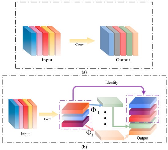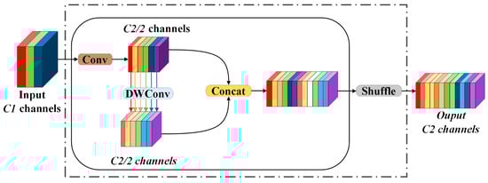 For GhostConv, the initial step involves generating m feature graphs , through the application of 1 × 1 convolution. The computational process is illustrated in Equation (6):