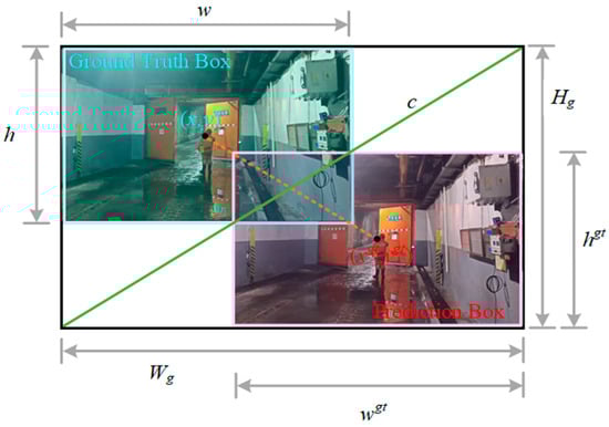 Considering the significant variations in the dimensions of real boundary boxes marked by different types of vehicle targets and the various tasks related to the identification of people and vehicles, as well as the inconsistent quality of samples, it is evident that higher-quality samples will improve the model’s fitting capability. Furthermore, the CIoU loss function imposes stringent requirements on the aspect ratio of geometries, and training on low-quality samples may adversely affect the model’s generalization performance. To address these issues, the WIoUv3 [30] loss function is proposed as a replacement for the CIoU loss function within the enhanced algorithm. The WIoU loss function, based on Focal EIoUv1, incorporates a dynamic non-monotonic focusing mechanism designed to evaluate the quality of anchor boxes by utilizing outliers instead of IoU. The expressions for WIoUv1 are presented in Equations (15) and (16), while the structural diagram is illustrated in Figure 7.