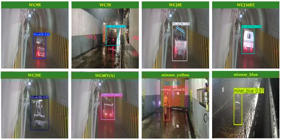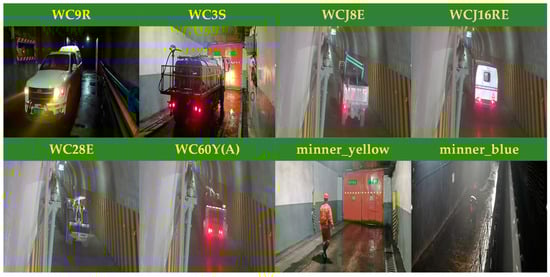 Due to the variety of vehicles operating in different scenarios, along with the various categories of miners navigating the coal mine, it is essential to improve safety measures for both personnel and company property in air door situations. Furthermore, there is a pressing need to enhance safety monitoring and inspection efforts within the coal mine. The various types of vehicles and personnel operating through the air door are categorized into eight distinct groups: WC9R explosion-proof trackless rubber-wheeled vehicles (WC9R), WC3S explosion-proof trackless rubber-wheeled vehicles (WC3S), WCJ8E explosion-proof trackless rubber-wheeled vehicles (WCJ8E), WC28E explosion-proof trackless rubber-wheeled vehicles (WC28E), WC60Y(A) explosion-proof trackless rubber-wheeled vehicles (WC60Y(A)), maintenance workers (miner_yellow), and coal workers (miner_blue). Samples of the different vehicle types and job categories are presented in Figure 8.