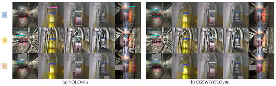As illustrated in Figure 9 and Figure 10, the CGSW-YOLO model effectively detected various vehicles and personnel, with no instances of missed or incorrect detections. Furthermore, the detection confidence under conditions of noise, occlusion, and contrast enhancement showed a slight improvement compared to that of the YOLOv8n model. Therefore, the CGSW-YOLO model is more proficient at accurately detecting vehicles and individuals in mine air door scenarios.