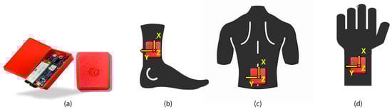 (a) Prototypical IMU, (b) positioning for the lower limb exercises, (c) positioning for trunk exercises, and (d) positioning for upper limb exercises.