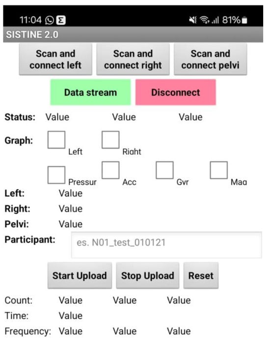 The Arduino Nano BLE facilitates the connection to a mobile application, developed using MIT App Inventor, version nb189 (© 2012–2024 Massachusetts Institute of Technology), that represents the transmission unit for the data collected during the exercises. The mobile application (Figure 3) securely stores data collected in a database (Firebase, Google, Mountain View, CA, USA).