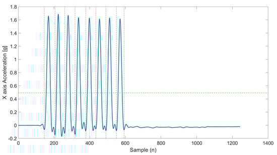 Example of repetition identification in the prototype’s data. The principal axis (in this case, the X-axis), is segmented in single repetitions (vertical red dashed lines). In green, the used threshold.