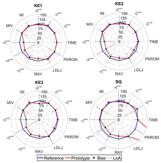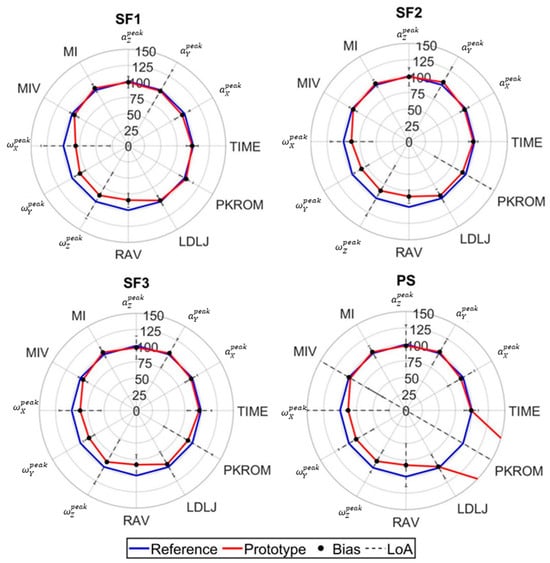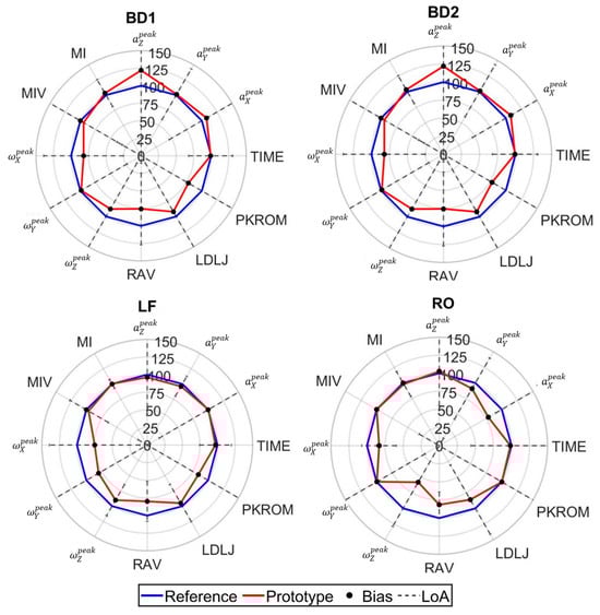 The difference between reference and prototypical IMUs sensors is demonstrated through radar plots (Figure 5, Figure 6 and Figure 7), based on the Bland and Altman analysis. In these radar plots, percentage values of prototype parameters are reported relative to the reference value, along with the bias and LoA between the two instruments. Quality parameter DTW was consistently heteroscedastic (Table A5) and was consequently excluded from Figure 5, Figure 6 and Figure 7. More details on the other BA parameters are reported in the Appendix A (Table A1, Table A2, Table A3, Table A4 and Table A5).
