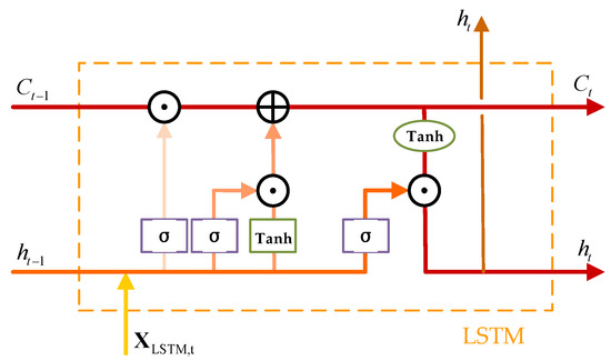 Due to the temporal correlation of DOA signals across snapshots, temporal sequence modeling is essential to improve estimation stability. To this end, an LSTM network is employed to enhance the features extracted by the CRDCNN. LSTM is an improved variant of the recurrent neural network (RNN), featuring a memory cell (cell state) that retains historical information, along with input, forget, and output gates that regulate the flow and updating of information. The structure is illustrated in Figure 4. In this figure, is used to indicate element-wise addition, while represents element-wise multiplication.