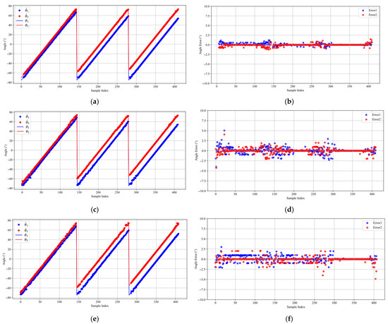 Two far-field narrowband independent signals with identical SNRs of 0 dB are considered, with angular intervals of . For each angular separation, Equation (31) is employed to generate the corresponding angle values, which are used to produce the test samples. Following the reconstruction of the spatial spectrum, the DOA estimates for each test sample are calculated according to Equation (30). The DOA estimation results obtained by the three DL methods are displayed in Figure 5, with the estimated DOAs shown on the left and the corresponding estimation errors on the right.