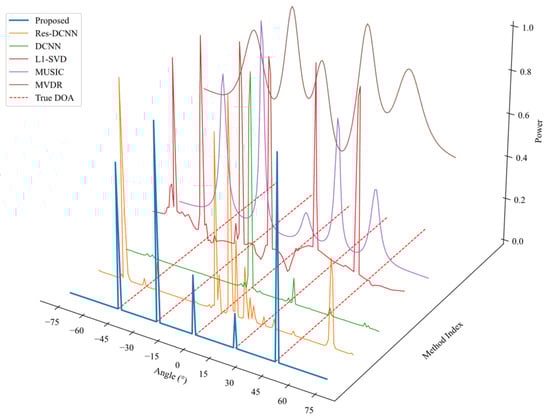In order to assess the generalization performance of various DOA estimation algorithms under multi-source conditions, this experiment generates sample data in scenarios with multiple signal sources. The proposed approach is compared with other DL methods as well as traditional techniques such as L1-SVD, MUSIC, and MVDR. Specifically, the number of sources is set to M = 5, with SNR = 0 dB, T = 100, and source angles positioned at . The DOA estimation results are visualized by plotting the spatial spectrum in a 3D space.