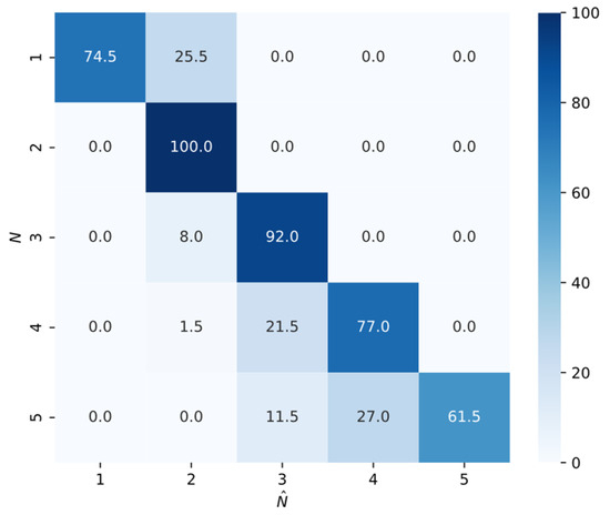 To further verify its generalization, the proposed model was tested on data with unknown source numbers , with 200 samples generated for each case and no prior knowledge of M provided. As shown in Figure 7, the confusion matrix illustrates that most predictions align with the ground truth, especially for M = 2 to 4. Even for more complex cases with M = 1 and 5, the model remains accurate despite being trained only on two-source samples, demonstrating strong robustness and generalization beyond its training distribution.