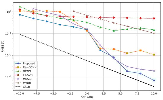 As shown in Figure 9, the number of snapshots has a significant impact on the DOA estimation accuracy of each method. Overall, most methods exhibit a decreasing trend in RMSE as the number of snapshots increases. However, noticeable differences in performance are observed among the methods under both low and high snapshot conditions. For snapshot numbers below 150, the MUSIC method produces notably higher RMSE values than other methods. While the MVDR method shows better performance than MUSIC, its overall error remains considerable, and the RMSE reduction with increasing snapshots is marginal. The L1-SVD approach exhibits relatively stable RMSE values over the entire snapshot range, consistently higher than those of other methods. In contrast, the DCNN and Res-DCNN methods show a reduction in RMSE as the snapshot number increases, but the decrease is gradual, and after T > 300, the convergence rate slows, and even slightly rebounds. Under T < 150, the RMSE of the proposed method is slightly higher than that of the MVDR method. As the number of snapshots increases, the error decreases more noticeably. When the snapshot count exceeds 200, the RMSE becomes significantly lower than that of other methods and gradually approaches the CRLB, demonstrating the effectiveness of the proposed method in different scenarios.