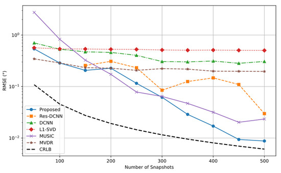 In this experiment, the SNR is set to 0 dB, and the source angles are configured as and . The experimental variable is the number of snapshots T, varied from 50 to 500 with a step of 50, resulting in multiple snapshot conditions. A total of 600 Monte Carlo trials are performed for each condition to ensure the statistical reliability of the results. Under these conditions, only the snapshot number is altered to investigate its influence on DOA estimation accuracy.