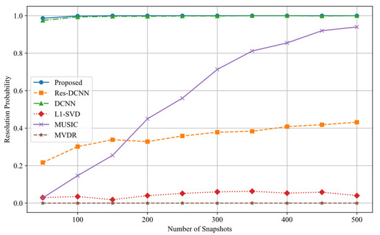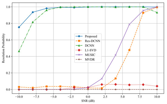 In order to assess the capability of the model in handling closely spaced signal sources, the resolution probability is defined as follows: In each simulation, let and be the estimated angles corresponding to the true angles and . If the sum of the absolute differences , we consider that simulation a successful resolution; otherwise, it is considered a resolution failure, and the resolution probability is obtained by computing the ratio of successful resolution occurrences. Two groups of experiments are configured to examine the effects of SNR and the number of snapshots, with the signal source angles uniformly set at and . The first group of experiments involves varying the SNR from −10 dB to 10 dB in 2 dB steps, with a fixed snapshot number of T = 256. In the second group, the number of snapshots is varied from 50 to 500 in steps of 50, while the SNR is held constant at 5 dB. For each SNR or snapshot condition, 600 Monte Carlo simulations are carried out to ensure result reliability.
