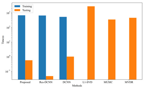 The computational complexity of each method is evaluated by presenting their respective time metrics in Figure 12 and Table 1. We constructed 10,000 random test samples distributed over different angles and SNR ranges, and all other parameters were set in accordance with Section 4.1. Experiments were conducted under Python 3.9 using PyTorch version 1.11.0 (with CUDA 11.3) on an NVIDIA GeForce RTX 4060 Ti GPU with 32 GB RAM. All randomly generated samples were processed using different methods, and the total prediction time was recorded. Compared to the other two DL-based approaches, the proposed model incurs a longer training time owing to its more complex architecture, which allows for direct input-to-angle estimation mapping. Although conventional methods bypass the need for training, experimental results show that DL models, once trained, can compute DOA estimates efficiently even with moderate computational resources. Due to its structural complexity, the proposed model exhibits marginally longer testing times than other DL models, yet remains significantly faster than traditional techniques, offering real-time capability alongside high measurement accuracy.