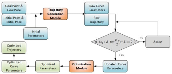 At this stage, the composite clothoid–arc–clothoid curve has been fully constructed, and the coordinates of the control points, along with the parameters for each corresponding segment, can be stored. With these parameters, the planned trajectory can be readily reconstructed using the derived clothoid curve equations. Within this composite curve, the curvature of the arc segment is given by . Since the curvature of a clothoid increases linearly with the arc length, also represents the maximum curvature of the entire trajectory.