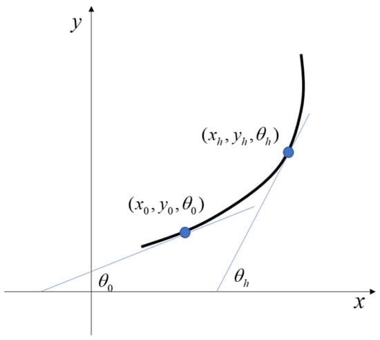 The meanings of the parameters in are as follows: is the curvature at the starting position, is the azimuth at the starting position, is the curvature at the target position, is the azimuth at the target position, and a is the curvature change rate of this curve. Additionally, a is the parameter of the clothoid curve, and for the arc curve, .