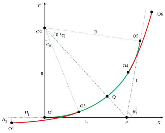 As shown in Figure 3, the green solid line represents the circular arc, while the red solid line denotes the clothoid segment. The composite curve starts at point , where the tangent angle is zero, and it ends at point , where the tangent angle is , representing the orientation difference between the start and target stations. The center of the circular arc is denoted by point , and its radius is R. The clothoid is tangentially connected to the arc at point .