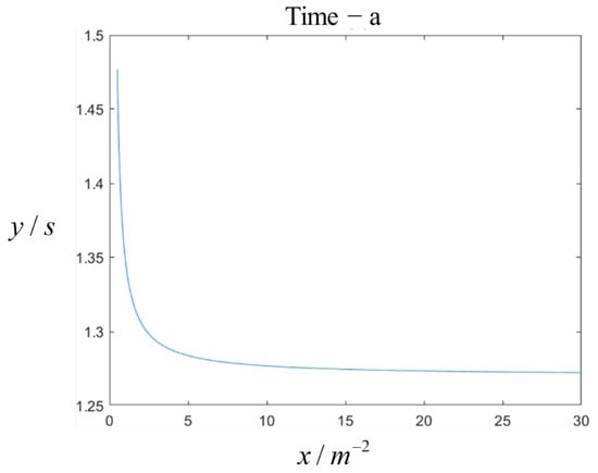 So far, a transition curve consisting of a clothoid curve–arc curve–clothoid curve has been constructed between the starting point and the target point after the coordinate transformation preprocessing. After the complete planning of the entire path, it is necessary to further discuss the influence of the clothoid curve’s parameter setting on the running time and trajectory. By solving Equation (36), the correspondence between the parameters can be obtained. Based on this, the running time becomes a function related only to the variable, allowing for a theoretical analysis of the monotonicity of the running time with respect to this variable. Experimental verification demonstrates that there is a monotonically decreasing relationship between the parameter and the running time: as the given parameter of the clothoid curve increases, the total running time of the entire path decreases. The results of a Matlab simulation and verification experiment are shown in Figure 4, with the parameters in the figure ranging from 0.5 m to 30 m. This relationship is based on the initial point, azimuth angle, target point, safety factor, and target azimuth angle. Since the physical conditions are not strictly limited and the actual two-wheeled differential mobile robot needs to undergo acceleration and deceleration phases, this conclusion can only serve as a reference for selecting the curvature change rate parameters.