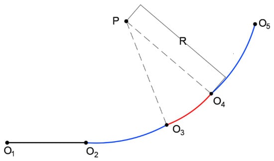 Therefore, once the a parameter of the clothoid curve is specified, the radius R of the arc segment can be computed using the method described above. At this stage, all necessary parameters for constructing the composite clothoid–arc–clothoid curve are determined. The next step is to consider how to represent this combined curve using control points and the associated parameters.