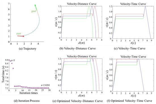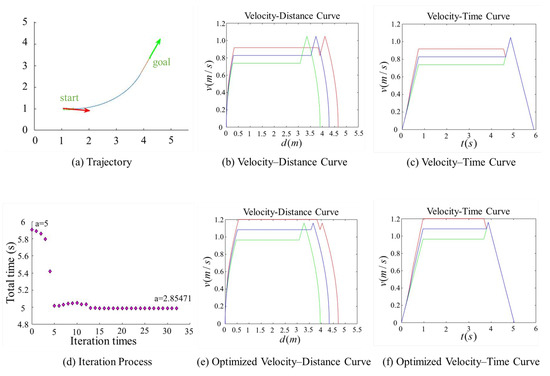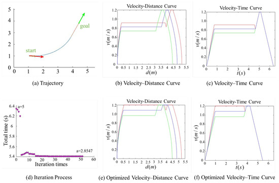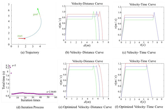 Figure 7, Figure 8, Figure 9 and Figure 10 present comparison graphs of the optimization algorithms under different scenarios, where the distance is measured in meters, the time is measured in seconds, and the speed is measured in meters per second. Due to the strong correlation between the optimization effect and the actual path, the degree of optimization cannot be precisely quantified. Based on the experimental comparison diagram, it is evident that the two-wheel differential robot achieves a higher linear velocity on the optimized trajectory, particularly along the clothoid curve and arc segments, while consistently maintaining high acceleration. Specifically, the initial pose in Figure 8 is consistent with that in Figure 7, while the target position is obtained by shifting the target point in Figure 7 forward by 0.5 m along its orientation. A comparison between Figure 7 and Figure 8 reveals that, due to the shorter straight-line segment in Figure 7, the robot must begin decelerating before reaching the maximum velocity , thus limiting the potential for higher speeds. Although the maximum velocity is still not fully achieved after parameter optimization, both the peak velocity and the average velocity are improved.