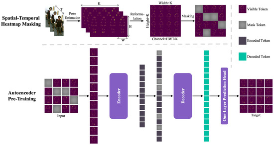 In the realm of self-supervised learning, the masked autoencoder has emerged as a significant tool, allowing models to acquire meaningful data representations by inferring masked or omitted portions of the input. By leveraging the information from the visible parts of the input, this method enhances the model’s comprehension of the inherent data structure. Germain et al. [33] pioneered the Masked Autoencoder for Distribution Estimation, a technique that enables autoencoder outputs to be interpreted as conditional probabilities, significantly improving the generation of models with complete joint probability distributions. Zhou et al. [34] investigated the application of masked autoencoders for pre-training Vision Transformers in the context of medical image analysis, showing their efficacy in pre-training tasks involving natural image analysis. Geng et al. [35] introduced the Multimodal Masked Autoencoder, which facilitates the learning of transferable representations across visual and linguistic data without the need for modality-specific encoders. Zhang et al. [36] provided a comprehensive survey that underscored the increasing interest in masked autoencoders for self-supervised learning in vision and other domains, highlighting its potential as a promising avenue for self-supervised learning research. Further expanding on these concepts, Radosavovic et al. [37] explored the use of masked autoencoders in practical robot learning scenarios, while Yang et al. [38] examined their utility in domain-invariant self-supervised learning. Liu et al. [39] proposed Masked Decision Prediction as a self-supervised pre-training technique for reinforcement learning and behavioral cloning, utilizing masked autoencoders to reconstruct absent data in state–action trajectories. Reed et al. [40] introduced Scale-MAE, a scale-aware masked autoencoder designed for multiscale geospatial representation learning, emphasizing the importance of understanding relationships between data at various scales. Additionally, Woo et al. [41] and Wang et al. [42] extended the applicability of masked autoencoders to Convolutional Neural Networks and video pre-training, respectively, demonstrating the scalability and efficiency of masked autoencoders in developing foundational models for diverse data types. Overall, masked autoencoders have demonstrated versatility and effectiveness as tools for self-supervised learning and pre-training across various domains. Methods such as SkeletonMAE [43] apply masking to coordinate sequences, struggle with pose estimation noise and lack explicit spatial–temporal structure. Therefore, this paper introduces spatial–temporal heatmaps as the input representation, masking entire joints over time intervals, preserving structural relationships in spatial–temporal dimension.