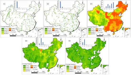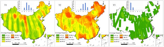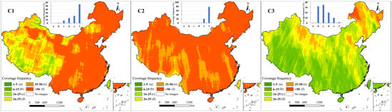 The C2 images were only distributed in the T1, T2, and T3 periods. The coverage rates in both T1 and T2 were 100%, with average coverage frequencies of 25 and 38 passes, respectively (Figure 3). In the T1 period, the area with a coverage frequency of fewer than 15 passes accounted for 14% and was distributed across different regions in China. Areas with a coverage frequency of more than 50 passes were mainly located in western Inner Mongolia, accounting for 2% of the total. Almost all areas in the T2 period had a coverage frequency exceeding 15 passes. Areas with a coverage frequency of more than 50 passes were mainly located in western Inner Mongolia, the Beijing–Tianjin region, and the northeastern Chinese border. The coverage area and frequency in the T3 period were lower than those in T1 and T2, with values of only 68% and four passes, respectively. The coverage frequency in 50% of the total area was fewer than five passes, and areas without imagery were mainly located in the western and central–northeastern regions of China.
