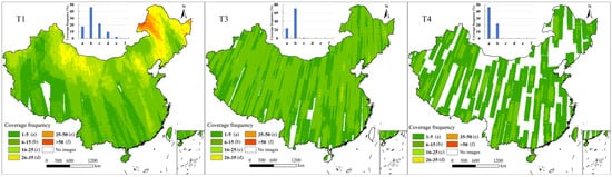 C3 imagery was available in the T1, T3, and T4 periods (Figure 4). The coverage rates in the T1 and T3 periods were relatively high, 98% and 96%, respectively, with average coverage frequencies of 13 and seven passes, respectively. In the T1 period, 86% of the total area had a coverage frequency of fewer than 25 passes. Areas with a coverage frequency of more than 35 passes were primarily located along the western border of northeastern China. The coverage frequency in the T2 period was concentrated between 1~5 and 6~15 passes, with area proportions of 24% and 71%, respectively. The coverage rate in the T3 period was 69%, with an average coverage frequency of four passes. The coverage frequency was concentrated between 1~5 and 6~15 passes, with area proportions of 47% and 22%, respectively.