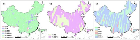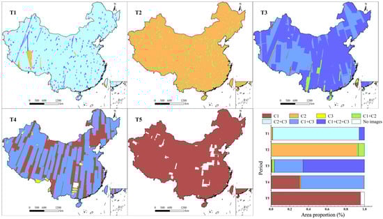 Although imagery at a certain resolution is available for all periods, the coverage proportion differences among different periods affect the regions, periods, and proportions based on which land-use detection can be conducted. The coverage proportions of C1 were relatively high in the T3, T4, and T5 periods, 100%, 98%, and 99%, respectively (Figure 6). As a result, the areas for which land-use change could be detected across T3, T4, and T5 accounted for 94% of the total area, meaning that two instances of land-use change, from T3 to T4 and from T4 to T5, could be captured by using C1 imagery. Since the coverage proportion of C1 during T1 and T2 was only 6%, only 2% of the total area allowed for land-use change detection across the five periods. The coverage of C2 during the T1 and T2 periods accounted for 100%, meaning that land-use change during these two periods could be detected across the whole of China. The area proportion of T1/T2/T3 was 68%, but only one-event land-use changes could be obtained for regions including Xizang and the northeastern and southern coastal areas. Due to the higher coverage of C3 imagery in the T1 and T3 periods (98% and 96%, respectively) compared with T4 (69%), the area proportion of the time spans associated with the T4 period was smaller than that excluding T4. Almost all areas (95%) allowed for the acquisition of land-use change between the T1 and T3 periods, while the corresponding proportions for T3/T4 and T1/T4 were only 65% and 68%, respectively. Two-event land-use changes across T1/T3/T4 could be captured in more than half of the total area (64%).