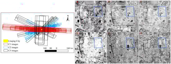 Table 2 presents the number and corresponding acquisition times of paid and free Keyhole images in different periods and at different resolutions for Linqing City. The total number of paid images (165) was larger than that of free images (24) at all three resolutions, and the number of paid images in each period was larger than that of free images. The proportions of different resolutions varied significantly between the two datasets. High-resolution C1 images accounted for over 40% of the paid imagery, whereas in the free imagery, they constituted only 21%. The temporal coverage of the free imagery was also limited, as it was missing certain periods covered by the paid data, such as T5 for C1, T1 for C2, and T4 for C3. Therefore, paid imagery potentially provides broader applicability for land-use change analysis than free imagery. The acquisition period of paid images starts earlier than or at the same time as that of free images and ends later than or at the same time as that of free imagery. As a result, the time span of the paid images was longer or the same as that of the free images. Specifically, the time span of both C1 and C2 paid images was longer than that of the free images, and only C3’s time span was the same in both datasets.