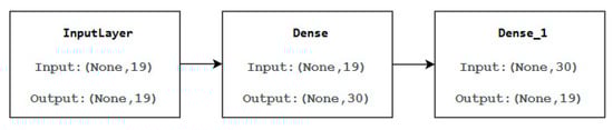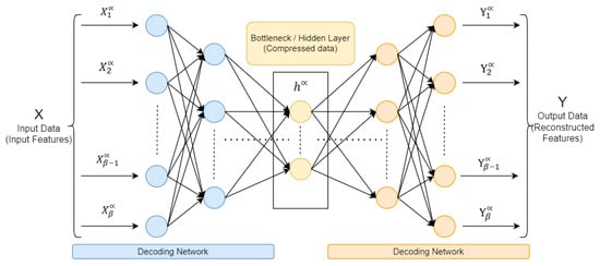 The input features X, which stands for the input data and is represented by the formula: X = (, , , …, , ), is transformed by the encoder into a hidden representation h, as seen in (1), which stands in for different levels of encoding and decoding. These layers create and generate an asymmetrical representation of the incoming data and reassemble it for the output layer. The bottleneck code is presented below, with (an activation function), W (a weight matrix), and b (a bias vector). Since, besides weights and biases, every neuron in a layer employs an activation function to determine its output by considering the weighted sum of its input data [].